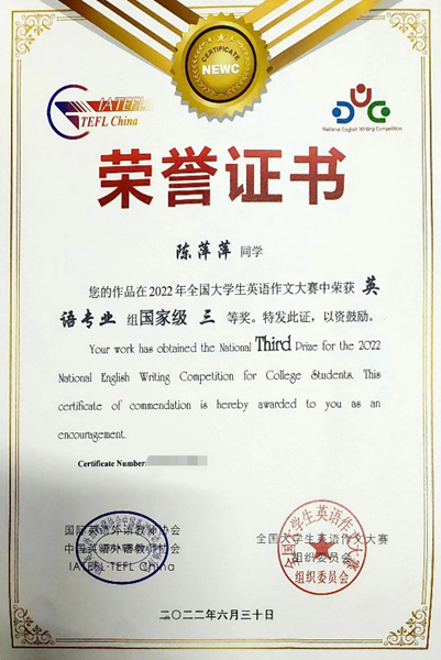 3. 2022年6月,获得全国老员工英语作文国家级三等奖;