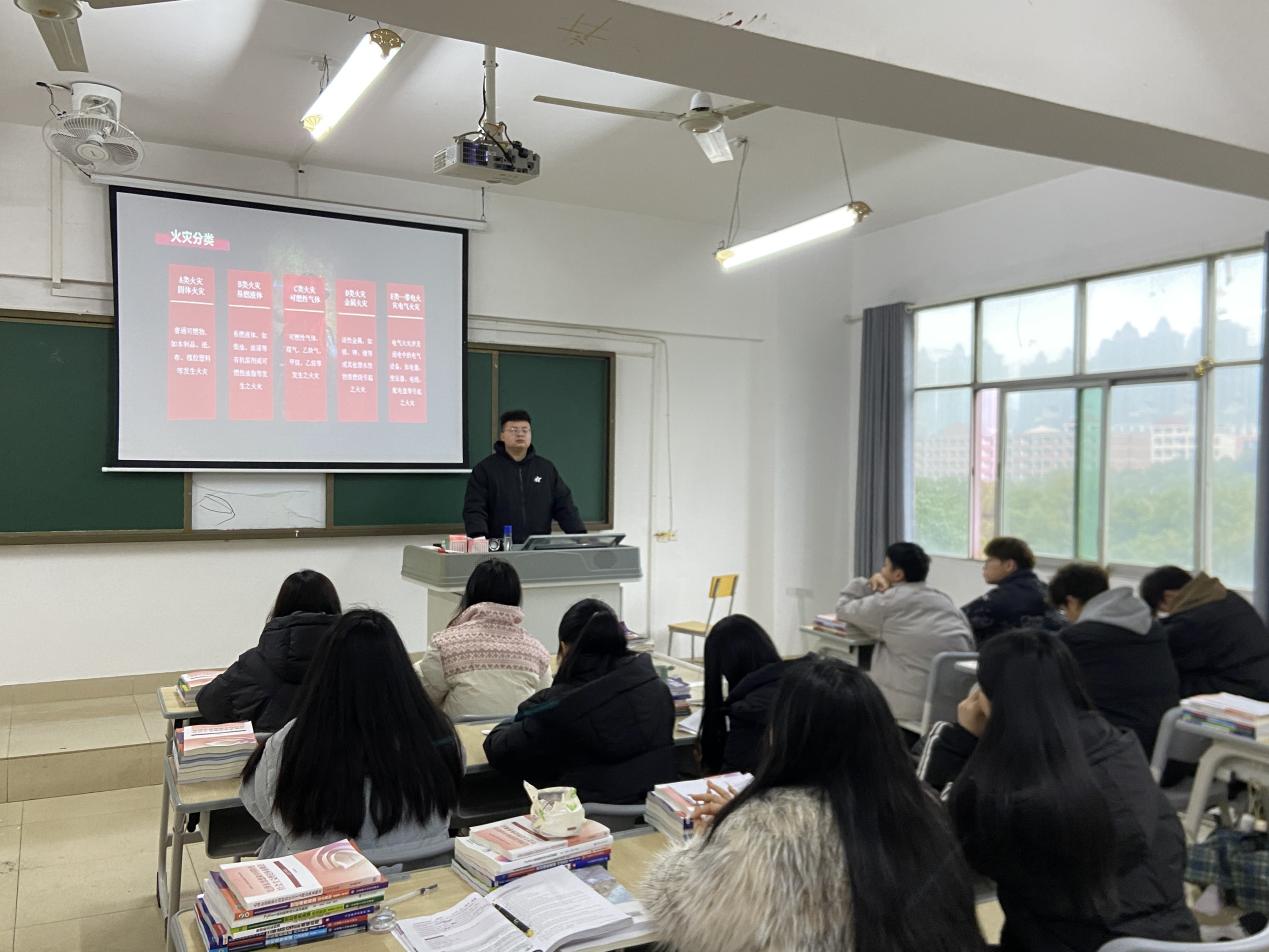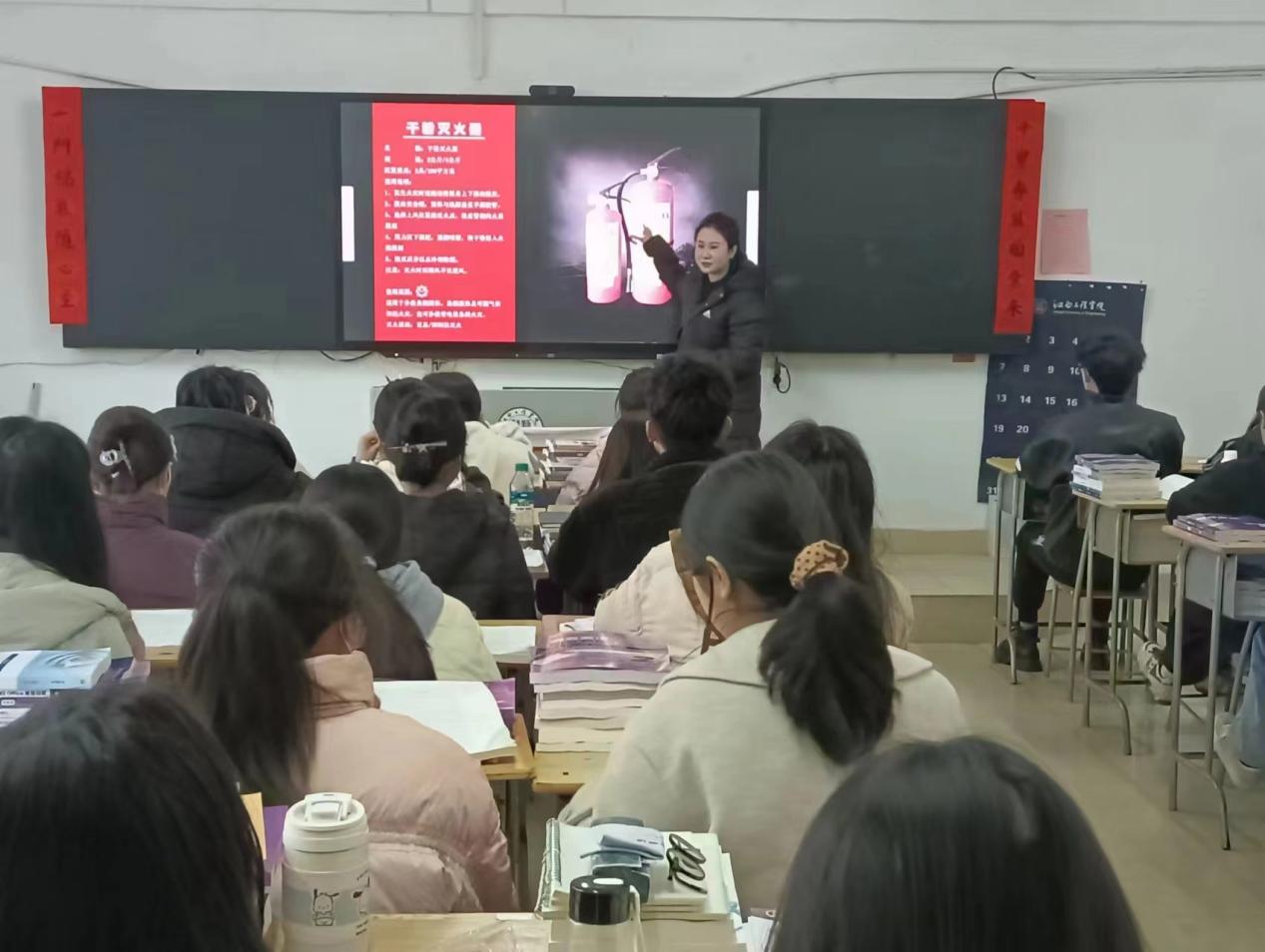 在班会上,辅导员(班主任)向同学们详细地讲解灭火器的各种样式与正确的使用方法。将生命交付于自己的手中,对自己的生命负责是这次班会的要义。熟练地掌握灭火器的使用才足以让我们在火场中镇静自救。