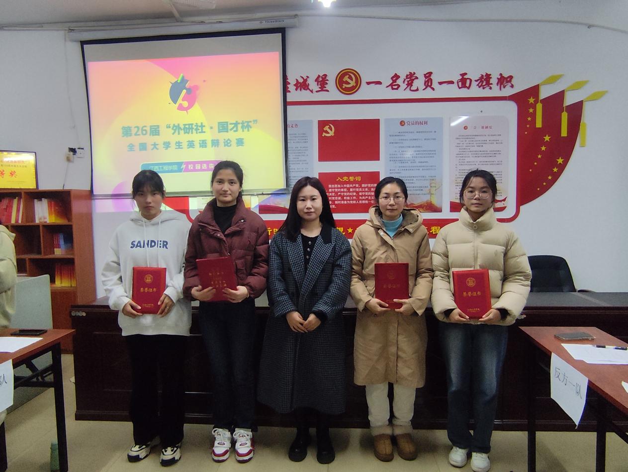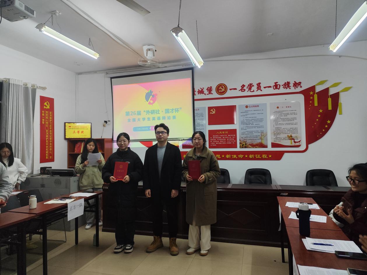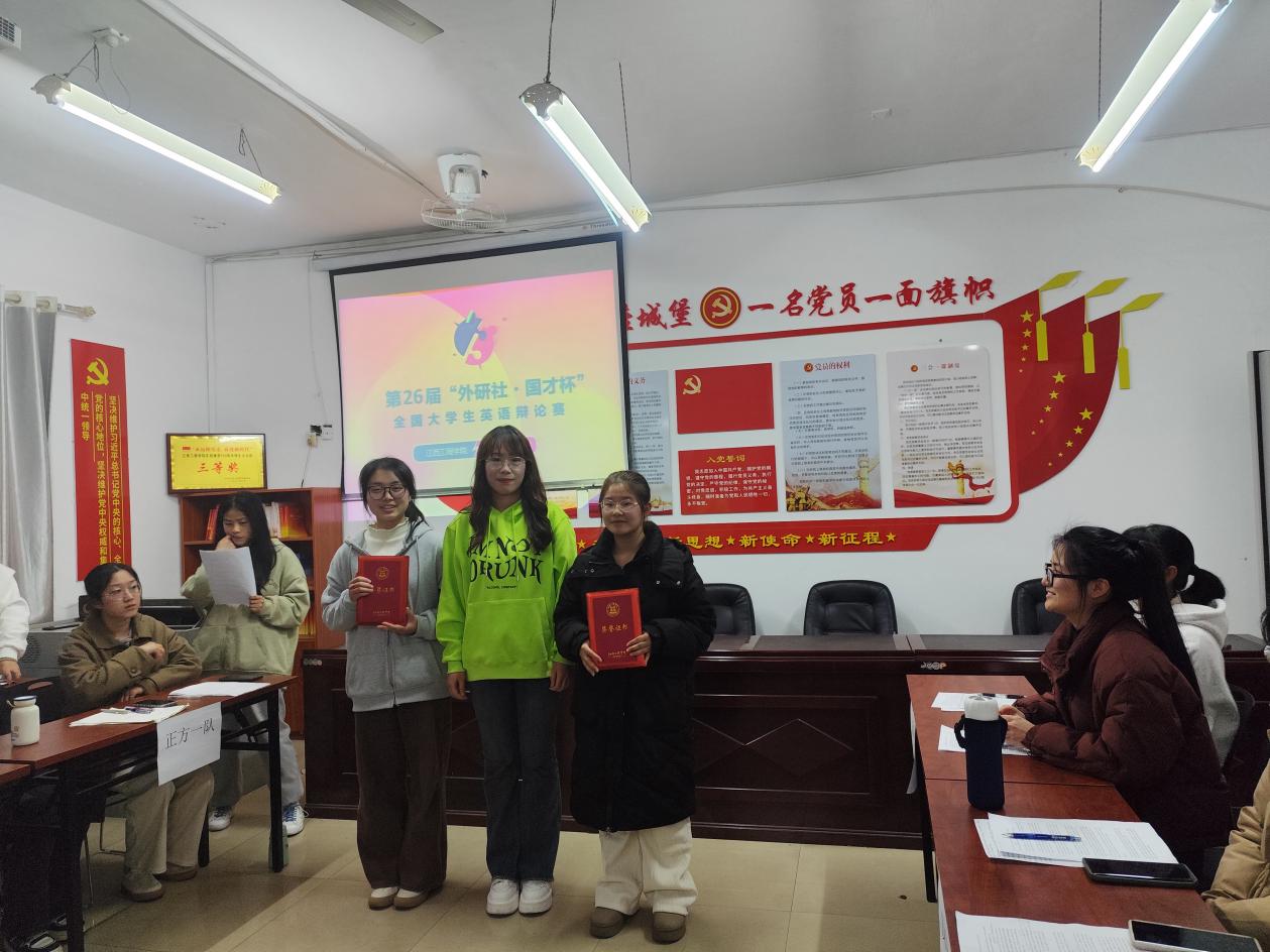 辩论赛尾声,主持人宣布各组得分结果,并由评委老师颁发奖状。