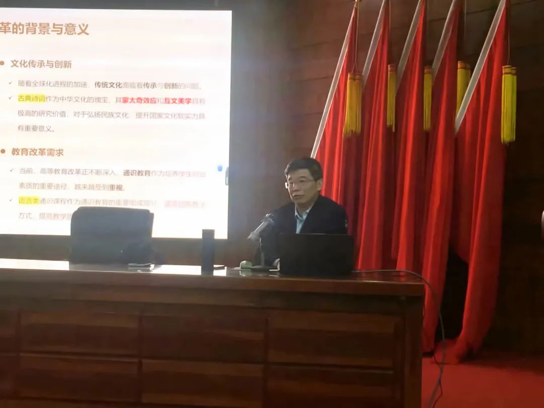 李教授在讲座中指出互文能力是检验个体学养的重要标尺。课堂话语是否有魅力,很大程度上取决于教师的诗意互文能力。本次讲座聚焦古典诗词之美,从意象的意义生成,蒙太奇的叠加和隐喻加工出发,阐释人类的喻性思维能够激活认知联想并产生互文效果,给人带来隽永悠长的心灵激荡。李教授的讲座内容丰富,观点新颖,娓娓道来,生动有趣,让在场的全体师生深受启发,获益匪浅。