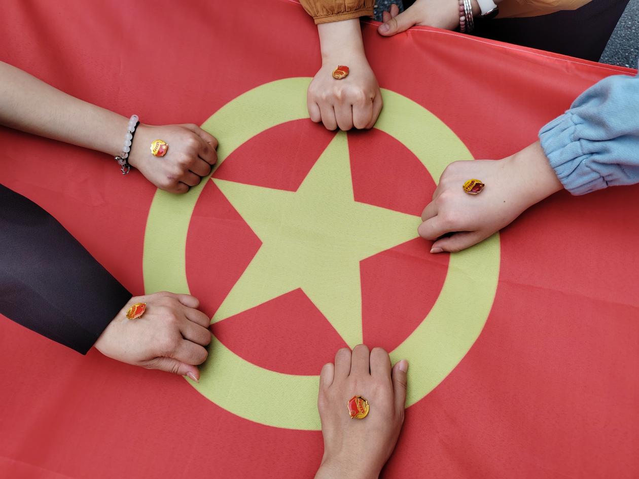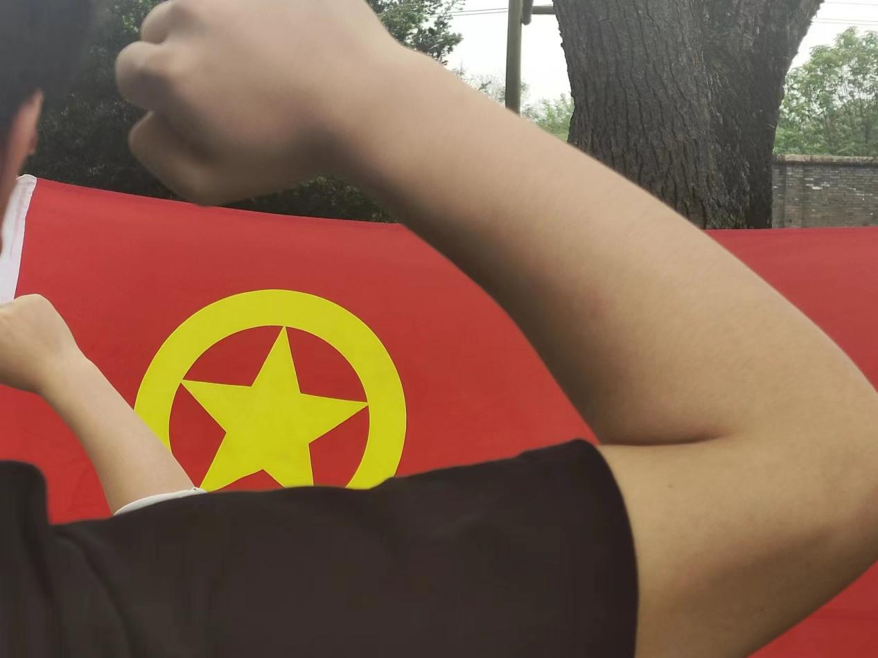 “我志愿加入中国共产主义青年团……”,同学们面对鲜红的团旗,高举右拳,重温入团誓词,用铿锵有力的声音向中国共青团作出庄严承诺。
