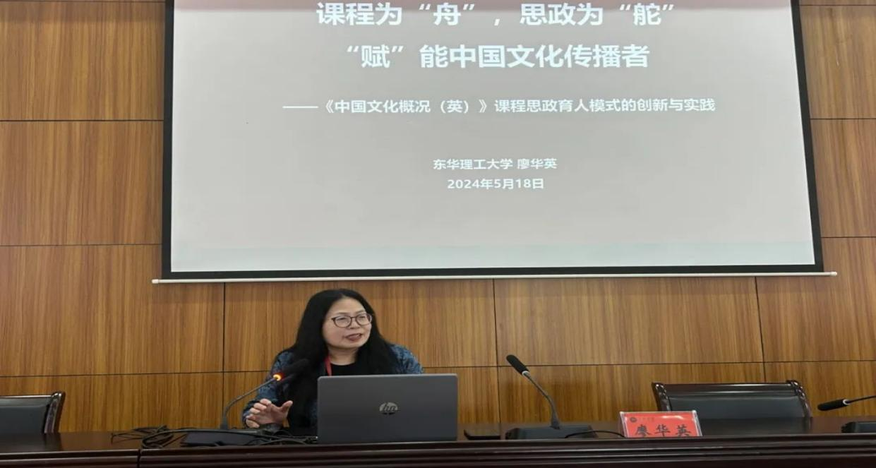 东华理工大学思政研究中心廖华英教授针对新文科、数字化和新时代背景下的育人需求,以《课程为“舟”,思政为“舵”,“赋”能中国文化传播者》为题,提出英语教学要以“思政”为舵,“赋”员工核心价值素养,解决“育什么人”的问题,并以产出为导向,提出一套教学创新模式。
