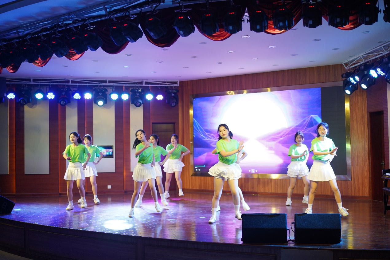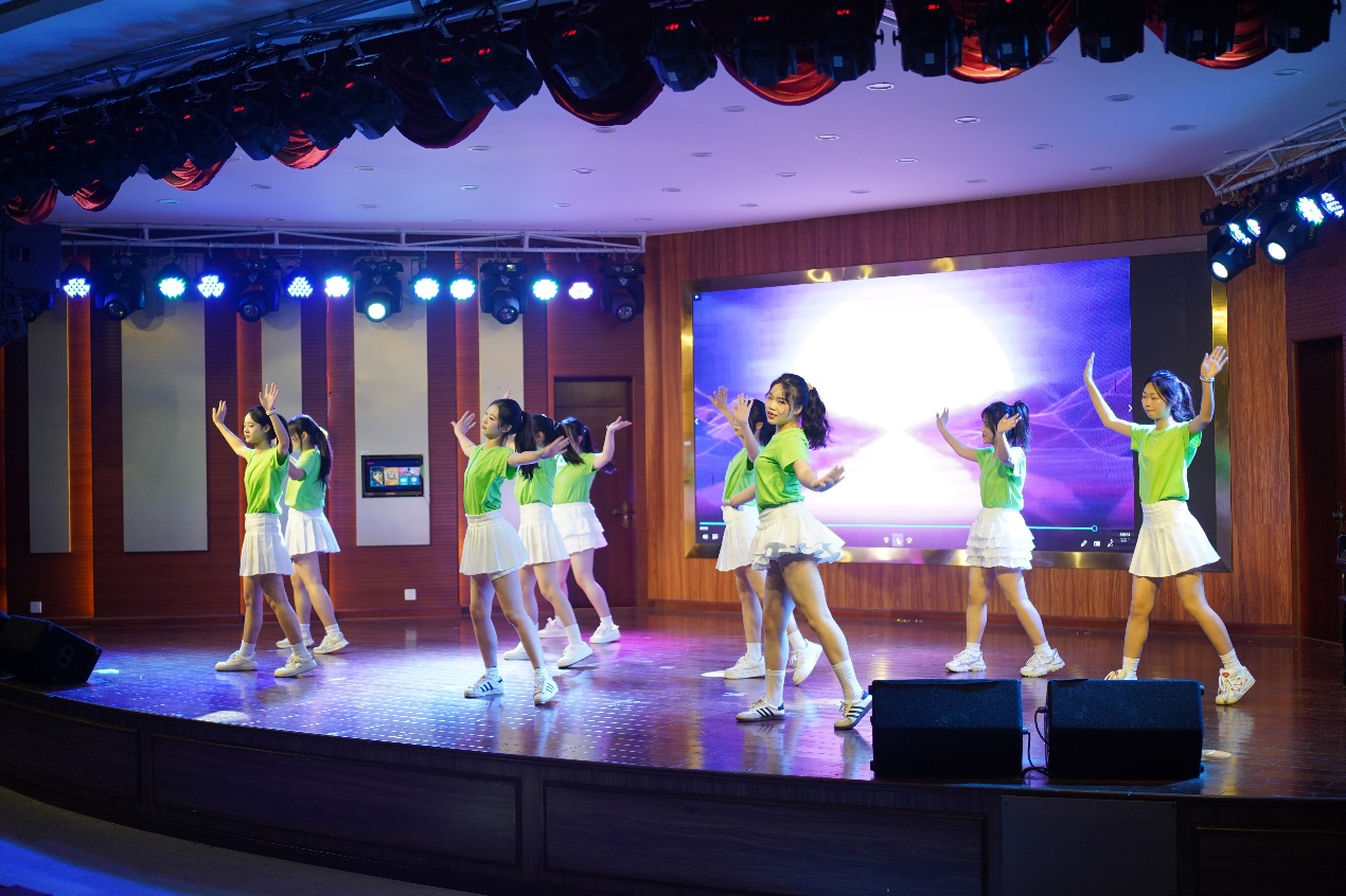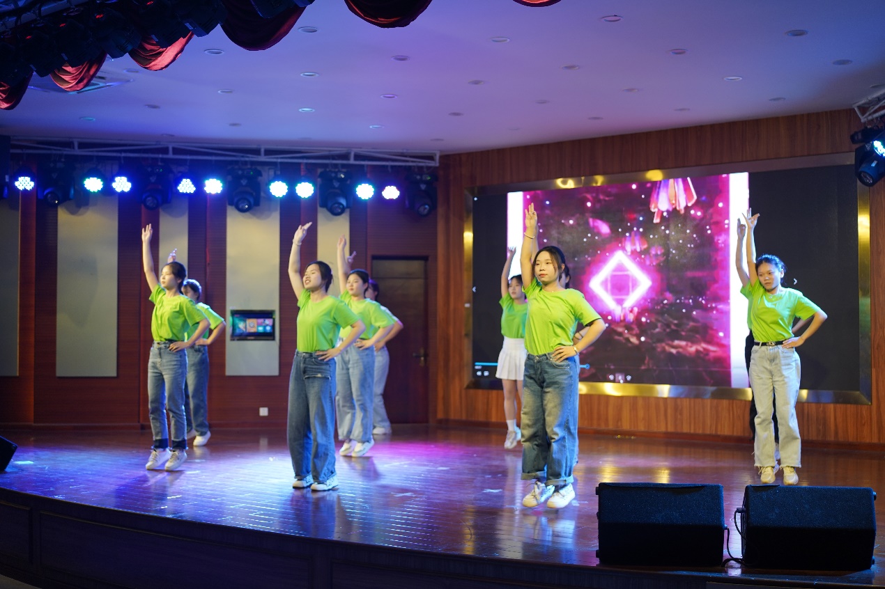 舞台上,同学们青春洋溢,面带微笑,随着音乐舞动,赢得了评委老师和现场员工的好评。背景音乐旋律轻快活泼充满感染力,带动着同学们的脚步,共同舞动起来。整齐划一的动作赏心悦目,守护青春的意气风发,充分展现了公司学子积极向上的精神风貌。