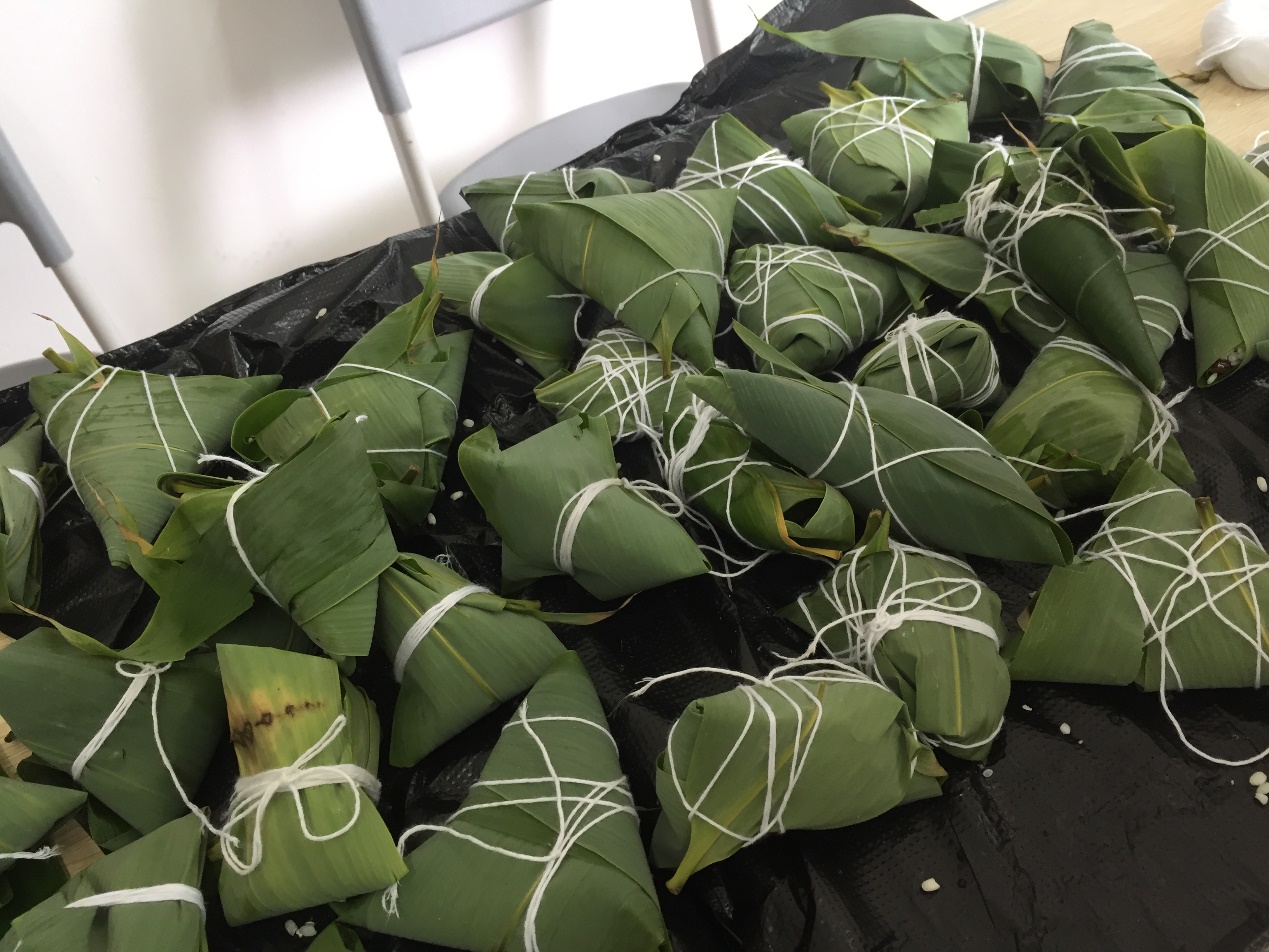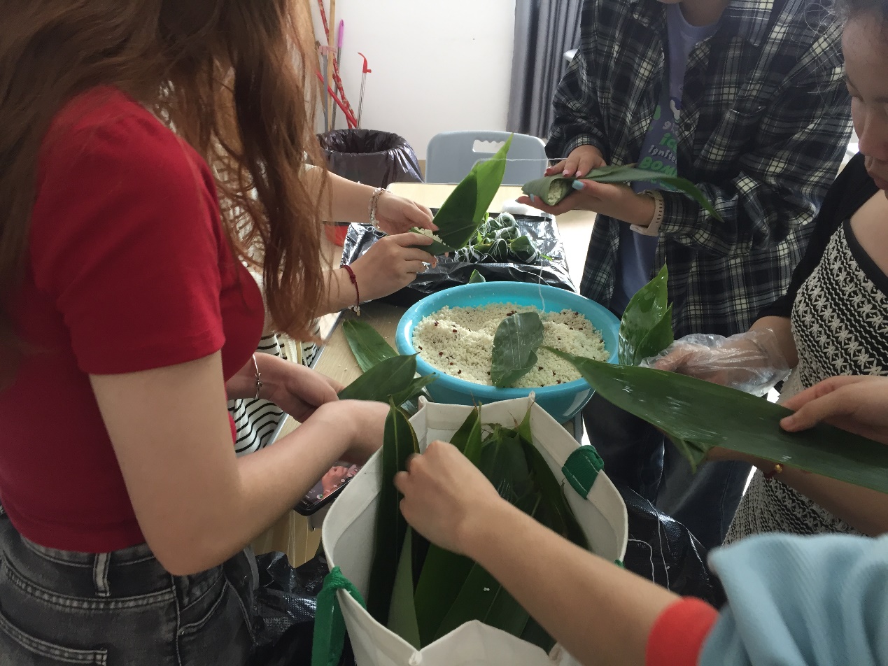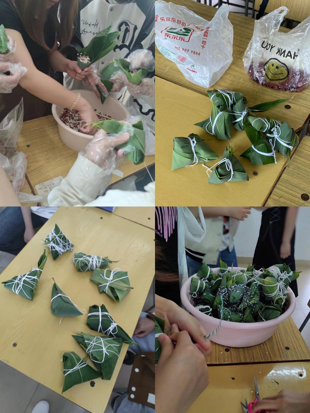虽然很多同学都是第一次包粽子,但丝毫不含糊,大家相互学习、请教,整个活动现场充满了欢声笑语,洋溢着节日的浓郁氛围。