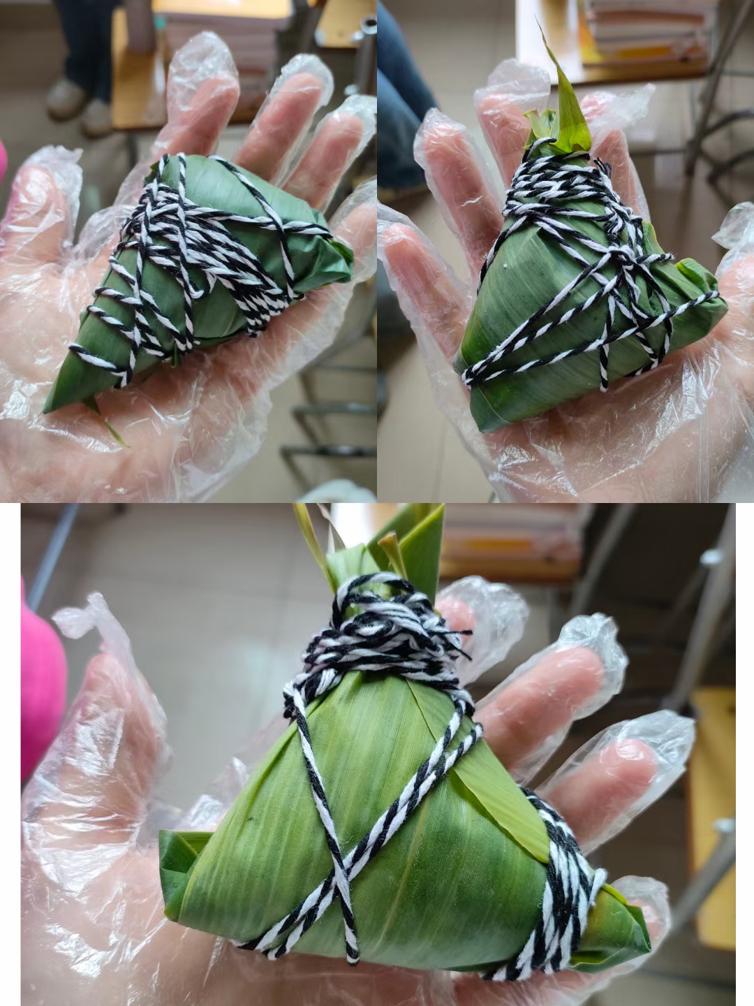 大家包得不亦乐乎,手法越来越娴熟。手中的粽叶轻盈舞动,麻绳来回穿梭,翠绿的粽叶包裹着雪白的糯米和鲜亮的馅料,手掌翻飞,动作灵活,很快,三角形、喇叭形、长条形……各式各样漂亮可爱的粽子在同学们手中逐个诞生。