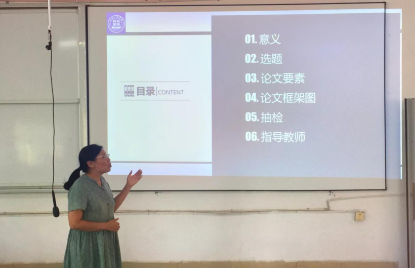 随后,车凤英从毕业论文的意义、选题、毕业论文的要素、论文的框架图、论文抽检以及指导老师六个方面详细地介绍了本科毕业论文撰写注意事项。她鼓励大家高度重视,认真准备,以严谨的态度和科学的方法完成毕业论文。
